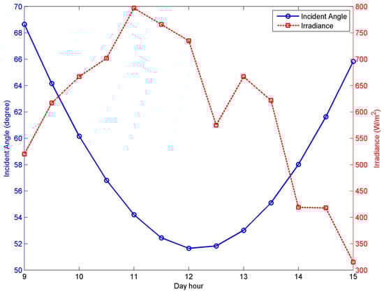 Figure 5 shows the solar irradiance versus the hour of the day measured by smartphone and irradiance meter. The measurements were performed at flat surface where the tilt angle is equal to zero (β = 0). In reference to the expected deviation of 30% as reported in the application manual [], the results measured by the smartphone are in good agreement with those measured by irradiance meter and the maximum deviation of the current measurements was within 20%. It is clearly seen, the radiation is getting higher as the day goes by, where the sun gets closer to the normal to the surface and, hence the incident angle (θi) decreases.