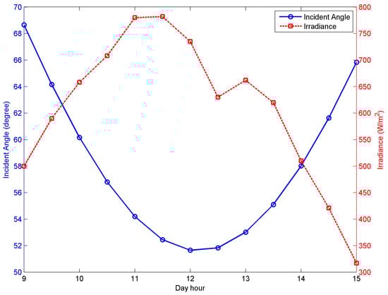 The relation between Incident angle, irradiance, and Day hour using the solar irradiance meter.