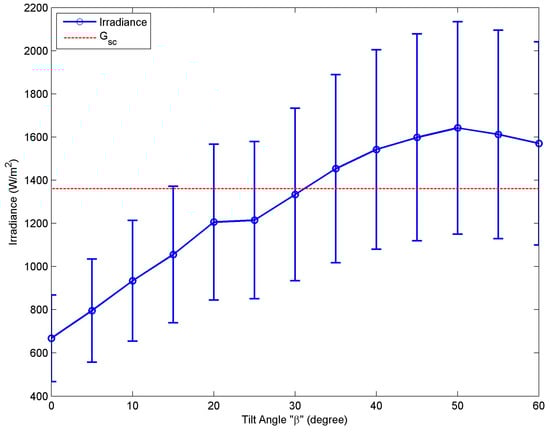 Figure 8 shows the effect of tilt angle on the solar irradiance measurement. The graph shows that, as β increases, so does the irradiance. As β increases, θi decreases as it gets closer to the normal to the surface vector, resulting in a larger irradiance being incident on the surface. Weather fluctuations have a direct effect on the irradiance and hence some measurements might be different than expected as evidenced by the constant irradiance between 20° and 25° tilt angles. The global solar constant Gsc (1361 W/m2) [] has been added in the figure and the 30% deviation error bars, as mentioned in the application manual, have been shown in the figure as well.