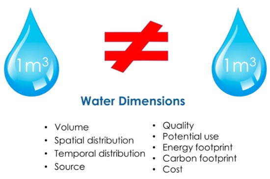 Discussions of projected water gaps across different regions are common in the literature. These projected water gaps often illustrate the difference between projections of water supply and demand. Addressing such gaps usually focuses primarily on identifying new alternative sources of water to boost supply, while also reducing demand within different water consuming sectors. While the availability of specific volumes of water (m3) is a critical determinant to our ability to produce food, cool energy-generating power plants, and provide water to our cities, it is not the only dimension to be considered (Figure 1): there is also a spatial dimension to water. The physical location of water is important: how far is it from its final use; is the future availability of one body of water more vulnerable to future climatic changes because of its location; is the same body of water subject to quality threats due to potential industrial leaks or intensified agricultural activity upstream; and, is it subject to future scarcity threats due to increased water demanded for economic activity upstream? There is a temporal dimension to water. Water availability varies with the time of the year: planning its allocation varies with the seasons. Climate change has an effect on rainfall patterns, causing intensification of rain events in shorter periods of time. Different sources and types of water come with different energy and carbon footprints. Is the water present at the surface, or part of a ground water aquifer? How much energy is required to treat, desalinate, pump or convey a needed amount of water to its final use? What is the impact on neighboring ecosystems? There are different qualities of water, which determine its suitability for different end uses: for example, water of certain levels of salinity might be suitable for salt resistant crops; urban waste water could be treated and allocated for different uses, including agriculture, landscaping, and others. Thus, allocating water (m3) by considering only demand and supply of its volumes, misses the bigger picture and the larger implications on the resource systems connected to water. This allocation model unravels once we also consider water in relation to those additional “coordinates”, W (m3, X:Y, Time, Source, Quality). The decisions made for the amount, time, location, source, and quality will, in turn, dictate the energy and carbon footprints, and the cost. Similarly, energy and food have multiple dimensions.