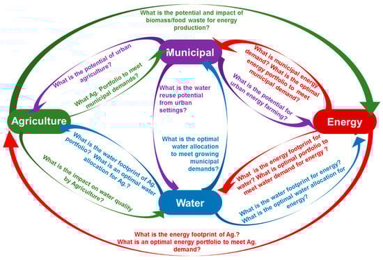 Global population will continue to increase for the foreseeable future. The middle class is rapidly growing, especially in developing regions of the world. Global threats, including climate change, the increasing vulnerability of global financial systems, inequity of resource distribution, and growing resource scarcity, among others, make the assessment of resource allocation alternatives at different scales ever more critical. Asking the right critical questions at the interface of these stressed resource systems and accounting for their multi-dimensionality becomes instrumental in effectively addressing the allocation challenges as we move forward. Figure 3 illustrates the critical questions schematically. These questions are aimed at the main interlinkages and interfaces across the different resource systems. Municipalities and urban settings are areas within which most of our population growth is concentrated. This makes these areas a source of increased pressures on resources, yet with a potential to contribute towards reducing them as well. For this reason, questions relating to the interaction between the water, energy, and food resource systems within these areas have been included. Our ability to model these questions, while holistically accounting for the influences and trade-offs associated with decisions made within various sectors, is a precursor to identifying synergistic interventions that reduce the extent of their interdependencies.