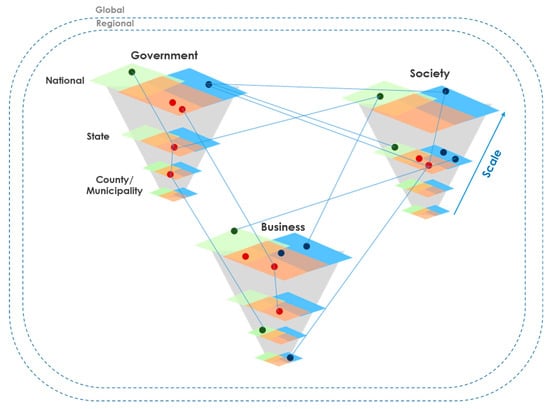 In addition to the complexity of the multidimensional physical resource interconnections, one must also deal with the reality that these common resources are consumed, regulated, and impacted by different stakeholders and decision makers (Figure 4). The concept of “tragedy of the commons” was first introduced by Hardin [28], who described the “commons” as any shared and unregulated resource. According to the ”collective action problem”, people acting independently will result in a worse outcome than if they coordinate. Individuals will work towards maximizing their own utility, making everyone, including themselves, worse off compared to when they act cooperatively [29]. Ostrom [30], one of Hardin’s critics argued that humans are more complex than he assumed and that resources can be managed through local contextualized governance solutions to local problems within local communities, thus avoiding the “tragedy” [31]. Her studies showed examples of how local communities successfully managed common resource pools, including forests and fisheries. Further research in recent years focused on the importance of understanding the interactions between natural and human systems [32,33,34,35,36]. Ostrom [37] introduced a multi-tier framework for analyzing interactions among linked social-ecological systems. Madrid et al. [38] applied concepts to the social-ecological system to develop a multi-scale integrated assessment of interactions between ecosystems and societal “metabolisms”.