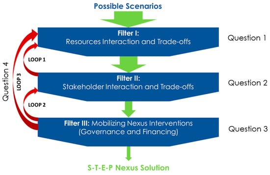 There are risks associated with planning and managing resource systems within silos. Solutions for such complex, interconnected, and uncertain problems cannot be only technical; they cannot account only for physical resource constraints, or offer only socio-economic, technological, political, or financial interventions. Proposed scenarios must be multi-faceted, and represent a complete package including an understanding of the resource systems, their interactions, and the biophysical and economic trade-offs between different projected pathways forward. Scenarios must be vetted with consideration of the nature of different stakeholders, their interactions, and the trade-offs that become apparent during dialogue, in negotiation, and through conflict. Once the bio-physical resource and stakeholder landscapes are understood, several potentially feasible scenarios are likely to emerge: these need proper governance structures and financing schemes to be realized and sustained. Thus, we can arrive at a STEP nexus solution: a proposed scenario vetted from socio-techno-economic-political (STEP) perspectives. Different suites of tools, models, and instruments are available to support researchers across disciplines in prescribing contextualized, holistic, STEP nexus solutions for a given resource challenges or nexus hotspots. Figure 6 presents a 3-Filter framework. The presented framework is intended to offer analysts, modelers, “nexus tool” developers, engineers, and social and policy researchers working towards addressing resource nexus hotspots—while each focus separately on vetting different aspects of proposed scenarios—a conceptual guideline with a suggested structured stepwise approach, and iterative feedback cycles, to guide their collaboration as they work towards arriving at STEP nexus solutions.