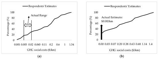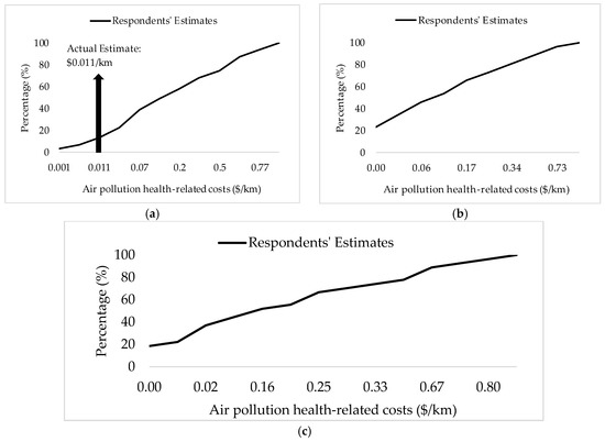 Figure 2a–c presents the distribution of respondents’ estimates of air pollution health-related costs for all three modes with the actual estimate of passenger cars. Figure 2a shows that only 3% of the respondents accurately estimated the GHG social cost for passenger cars, 87% of the respondents overestimated this cost, and 10% underestimated it. No actual estimates were calculated for Figure 2b,c, but we assume that the actual estimates for the metro and the bus (per passenger) should be lower than that for passenger cars ($0.011/km), similar to the GHG social cost estimated earlier. Hence, around 80% would have overestimated this cost for the metro and the bus.