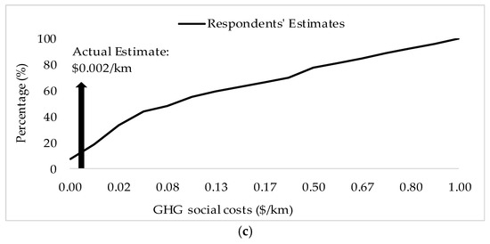 Figure 1a–c presents the distribution of respondents’ estimates of GHG social costs for all three modes and the respective actual estimates. Figure 1a shows that only 20% of the respondents accurately estimated the GHG social cost for passenger cars, 70% of the respondents overestimated this cost, and 10% underestimated it. Figure 1b shows that only 18% of the respondents estimated the GHG social costs for the metro accurately, and the remaining 82% overestimated it. Figure 1c shows that only 2% of the respondents estimated this cost for the bus accurately, 63% overestimated it and 35% underestimated it. In fact, respondents are not aware of their personal transport emissions when choosing among different modes, which potentially leads to higher shares for driving (with relatively lower perceived GHG costs). However, the actual data for Montreal shows that cars are the largest emitters, followed by the bus, and then the metro. Providing this information to transport users would correct their perceptions and could trigger a shift in demand toward more sustainable public transport modes.