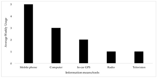 Figure 3 displays the respondents’ weekly usage of travel information through different tools. The respondents mainly rely on interactive maps on their mobile phones. This is followed by interactive maps on computers, and in-car GPS. This result is expected as travel information systems on mobile phones are easily accessible anywhere and anytime. In addition, it shows that a mobile application could be the most preferred/used tool to provide the fuel and environmental information. Okazaki and Hirose [38] assert this point when they examined the media choice when searching for travel information in Japan. They found that searches for travel information through mobile phones exceed that via computers and radios.