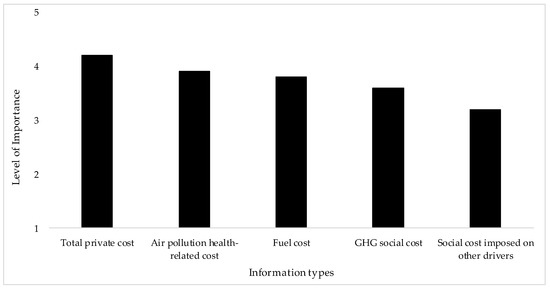 The survey also sought to determine the respondents’ preferred type of travel information. As shown in Figure 4, the respondents preferred to receive information about their total private travel costs (an average of 4.2 on a five-point Likert scale), including travel time costs, fuel costs, and emissions cost. This is followed by health-related air pollution costs with an average of 3.9 and then fuel costs with an average of 3.8. The respondents ranked health-related costs above fuel consumption information, which could be attributed to the direct linkage between the health costs of air pollution and their own benefits/costs. Therefore, the respondents would like to know these costs as they are directly related to their own well-being. However, since GHG social costs are imposed on the society not individuals, the transport users did not perceive them as their own costs. As a result, GHG costs were the least preferred information to the respondents.