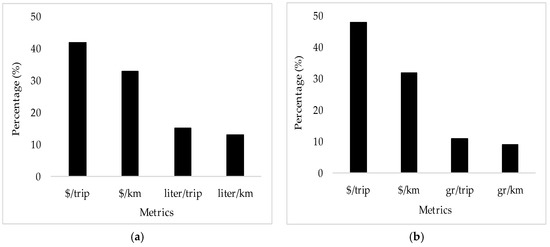 Figure 5b shows that almost half of the respondents preferred receiving GHG social costs and health-related costs in $/trip. This is followed by $/km which was preferred by 32% of the respondents. In addition, 20% of the respondents wished to receive such costs in terms of grams of emissions/km. Similar to the fuel consumption metrics, the respondents preferred monetary metrics which were easy to perceive. They also chose per-trip metrics over per-km metrics as the per-trip metrics provides them with their final trip cost without the need to carry out any calculations. There are no studies to the best of our knowledge that asked travelers about their preferred travel-related fuel and environmental metrics. However, numerous studies [42,43,44] tend to monetize the health and environmental impacts of transportation to help transport analysts, decision makers, and transport users evaluate different aspects of their decisions.