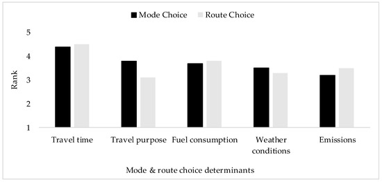 Another stated preference question was asked to examine the most influential factors in transports users’ route and mode choices. The respondents gave a rank for several travel attributes (for instance, travel time, travel purpose, and so on), on a five-point Likert scale, based on the impact these travel attributes have on their route and mode choices. The authors computed the average ranks for every travel attribute to determine the most influential factors.