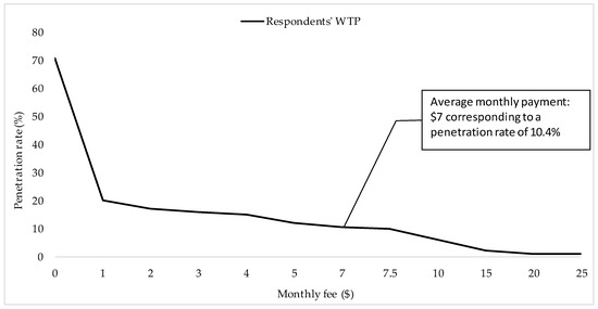 The final system design requirement that this study examined was the potential willingness-to-pay for such information. 71% of the respondents showed interest in using the ATGIS, out of which 30% were also willing to pay an average monthly payment of $7 ($5.7 US) in exchange for the travel information. This value is consistent with what previous studies found about the willingness-to-pay for travel time, navigation, and public transit information with estimated average values of $5 and $6 (in 1996 USD), and $10 (in 1997 USD) [24,25,36]. Using the willingness-to-pay responses, the authors calculated the ATGIS’s penetration rate for each amount reported by getting the percentage of the respondents out of the total sample that were willing to pay at least each monthly fee reported. Figure 7 presents this penetration rate as a function of the monthly fees to be charged.