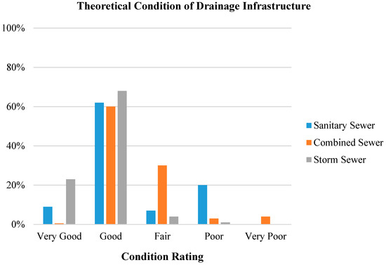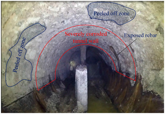 Currently, concrete MIC issues have emerged throughout the sewer system in the City of Edmonton (COE), Canada. Many sewer tunnels are significantly deteriorated. For example, in Figure 1, the chamber and tunnel segment (located under the 127 street and 153 Avenue in Edmonton; constructed in 2001), was found severely deteriorated, showing peeled-off zone and exposed rebar in a walk-through inspection conducted in 2016. As a result, the lifetime of this chamber has been significantly reduced from 75–100 years to less than 20 years. In general, the lifetime of many sewer tunnels built in the 1960s and 1970s has been greatly reduced from 75–100 years to less than 50 years. Severe corrosion (up to 100 mm in depth) was even observed in sewer tunnels built in the late 1990s (e.g., Clareview Sanitary Trunk). As shown in Figure 2, up to 20% of the sanitary infrastructure was reported to present poor conditions [6]. To repair the deteriorated sewer infrastructure, the COE has been spending a significant portion of its budget on rehabilitation. In 2009, the emergency repair cost was $6.5 million CAD. By 2015, this number had jumped to $16.8 million CAD [7].