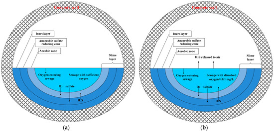 The amount of H2S that can be emitted from the slime layer is highly dependent on the DO level in sewage [10]. If the DO level is high, H2S will be oxidized by the SOB in the aerobic zone—the first layer. As a result, no H2S can escape from the slime layer to the sewage, as shown in Figure 4a. On the other hand, when the DO level in sewage is low, and DO is not enough to consume all the H2S, the H2S (aq) can diffuse through the aerobic zone—the first layer—and then disperse in the sewage as H2S (aq), as shown in Figure 4b.