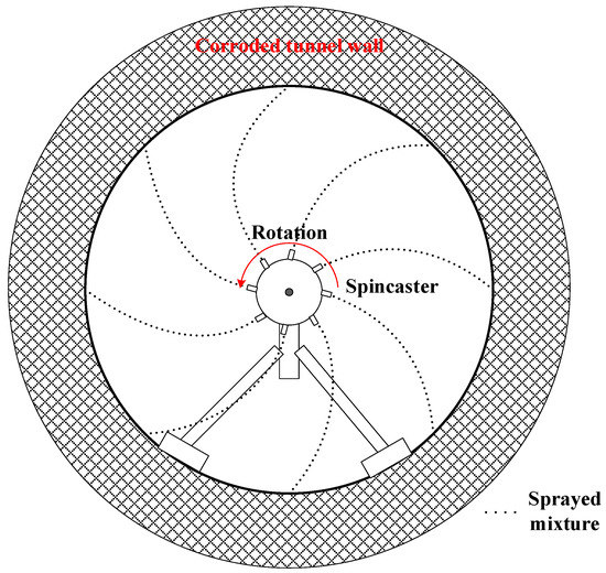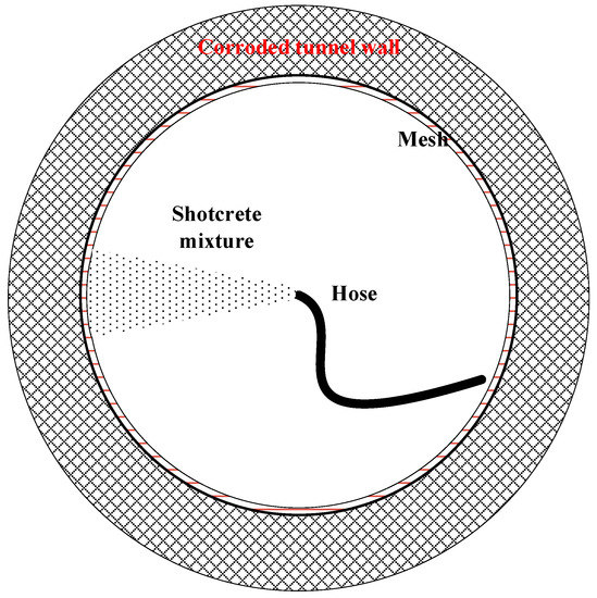Shotcrete is the method of pneumatically spraying fresh cement-based mixtures onto a surface through a hose at a high velocity [70]. There are two types of processes—wet-mix and dry-mix. In the dry-mix process, water is added at the nozzle, while, in the wet-mix process, all ingredients are mixed with water before being introduced to the delivery hose and the nozzle. As shown in Figure 6, shotcrete mixture is conveyed through a hosepipe and then sprayed via a nozzle onto the corroded tunnel wall. During the rehabilitation, mesh is often incorporated in operation to limit cracking and provide structural support.