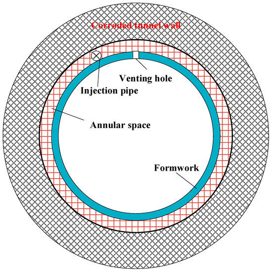 Cast-in-place concrete is an effective rehabilitation method for a variety of sewer shapes. The designed steel mesh is affixed to the existing pipe as reinforcement. As shown in Figure 7, formwork (slip-forms or fixed-forms) are set up to provide the finished wall section prior to concrete placement [68]. The gap between the formwork and the tunnel wall is the annular space that will be filled later. A venting or overflow hole is required at the highest point of the formwork that not only provides a path for air to escape when fresh concrete is injected. This venting hole also informs the worker to stop grouting when it is overflowed [72,73]. After the formwork, a grouting pipe can be laid in the crown of the sewer tunnel. Then concrete ingredients are introduced and mixed in the grout plant on the ground. The readily mixed fresh mixture is next pumped to the grouting location through the pipe laid on the crown of formwork. When the venting hole is overflowed, the grout operation stops, and then the venting hole is sealed with a plug.