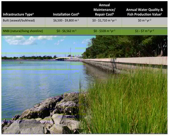 Natural coastal infrastructure, including beaches, dunes, oyster and coral reefs, seagrass beds, and marshes, can reduce wave energy, coastal erosion, and flood hazards [,,,,,]. For example, insurance industry models estimate that wetlands have saved more than $625 million in avoided flooding damages and that communities behind marshes experienced 20% less property loss during Hurricane Sandy []. There are also numerous opportunities to combine built and natural infrastructure in hybrid NNBI designs to provide additional storm erosion and flooding risk reduction, as well as the additional co-benefits that built infrastructure typically fails to deliver. Coastal NNBI co-benefits include the creation of habitats for commercially and recreationally valuable fishes, maintenance and enhancement of biodiversity, improved aesthetics and access to “nature” that can increase tourism and recreation, and improved water quality, with estimated benefits valued at over $100 billion annually [,,,,]. Citywide Rebuild by Design© projects [] and innovative urban flood management approaches that use novel engineering designs to mimic and restore natural landscapes are being used to improve flood resilience in New York, Bangladesh, and cities throughout the Netherlands []. Additional examples of the use of NNBI include site-specific “living shorelines” for erosion protection of waterfront properties (Figure 2, [,]), and stream-design culverts to restore natural tidal flow and reduce flood damage to roads and adjacent properties (Figure 3; []).