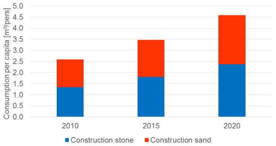 In the wake of major economic reforms introduced in 1986 (Doi Moi), Vietnam’s planned economy has been transformed into a “market economy with a socialist orientation”. Achieving steady growth of over 5%, low labor costs and a stable political environment, Vietnam has enjoyed a positive reputation over the past few years as an attractive business location. In 2016, the country’s population was 92.7 million and the nominal GDP US$197 billion []. While the country structures are still heavily agricultural and 70% of the population lives in rural areas, there is a strong trend of migration towards the urban centers. In 2011, the mining industry generated 11% of the country’s GDP. Due to its economic development, population growth and internal migration, Vietnam is currently enjoying an extraordinary boom in construction, which of course has raised demand for building materials. Figure 1 shows the expected development for the period 2010–2020 of per capita consumption of stone and sand for construction [].