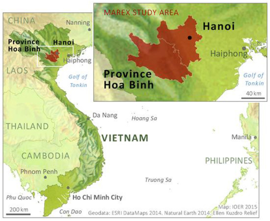 Location of the Vietnamese capital Hanoi and Hoa Binh Province (Source: IOER based on ESRI DataMaps 2014, Natural Earth 2014, Ellen Kuzdro Relief).