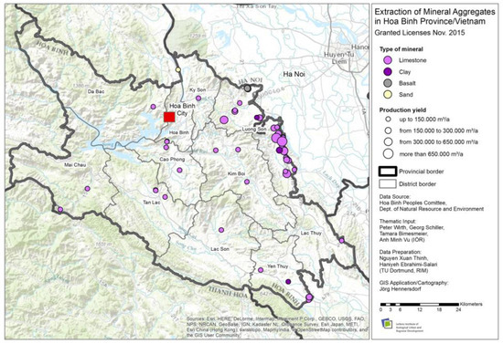 - Luu Duc, M.; Ngo Trung, H.; Nguyen Tien, T. The Integration of Spatial Planning and Environmental Protection for Construction Material Mining Areas in Luong Son Disctrict, Hoa Binh Province. In Institute of Environment and Automation (IEA)/Leibniz Institute of Ecological Urban and Regional Development (IOER), Proceedings of the International Conference on Environment and Sustainable Development in Mineral Resource Extraction, Hanoi, Vietnam, 29–30 October 2017; Vietnam Academy of Science and Technology Press: Hanoi, Vietnam, 2017; pp. 178–184. ISBN 978-604-913-623-8. [Google Scholar]