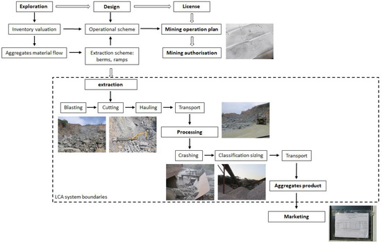 The analysis model calculates lifecycles for processes and scenarios, i.e., it considers all processes from resource extraction (primary energy and, raw materials) to final energy or material use, and also includes auxiliary energy and material uses as well as materials for constructing energy, material and transport systems. The impact categories in the present LCA were selected due to their representativeness for aggregate mining and the availability of respective data in the GEMIS database. Results were validated using the eco-bau LCAs of the Swiss Society of Sustainability in Public Construction [], an association jointly set up by federal and local construction authorities in Switzerland to promote ecological and healthy building. The system boundaries in the present LCA encompass the activities of extraction and processing as well as the internal traffic at the processing site undertaken to obtain the product (limestone and basalt aggregates). Further processing, transport to the construction site, use as building material and recycling are not subject of investigation.