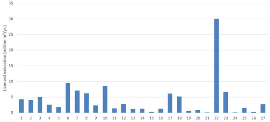 The mean excavation area is 7.3 ha. Almost 50% of excavation sites are smaller than 5 ha with 80% smaller than 15 ha (Table 3). The licensed extraction quantity of the 27 companies which responded to the questionnaire is shown in Figure 5. It ranges between 5 and 30,000,000 million m3/year. Many companies are classified as micro-enterprises as the annual output is ≤40,000 m3.