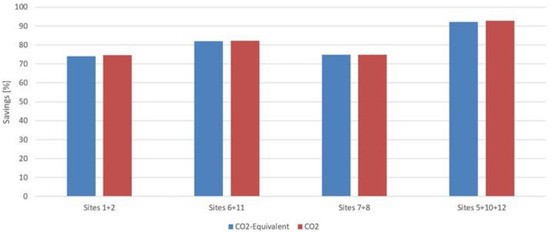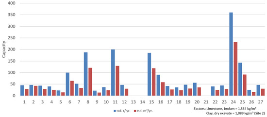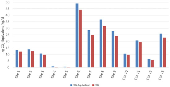 At first glance, some sites (e.g., Sites 2 and 3) seem to have similar values to the reference site. However, it should be remembered that these opencast mines are running at only 50% capacity, whereas Ostrau provides 90% capacity utilization (the capacity utilization value is derived from field observations that most of the companies are over-mechanized, and machines are only sporadically in operation). The only site which is comparable to Ostrau in all categories of activity is Site 11. To achieve a more sustainable and environmentally-friendly production of aggregate, work processes must be coordinated to increase the operating times of equipment. Furthermore, mining work at adjacent sites could be combined to ensure a higher rate of operation of machines and equipment.