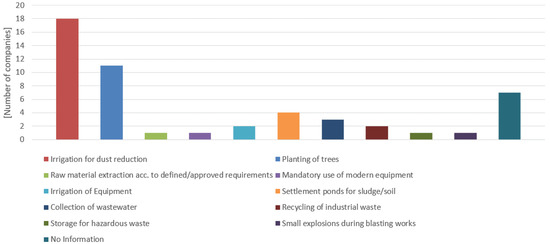 Figure 7 shows the various measures to reduce environmental impacts named by 74% of surveyed companies. No other measures for the reduction of impacts were reported. Fourteen companies provided information on waste generation. The types of waste encompass wastewater and solid waste, dust and rock wastes, as well as industrial waste (multiple entries possible).