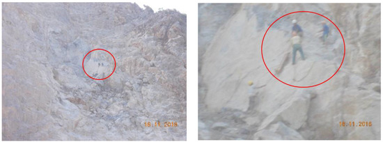 Identified operational gaps: Almost all of the investigated opencast mines show non-compliance with Best Practice technologies in open cast mining. Instead of standard exploration and pre-processing techniques such as the construction of slopes, berms and ramps, dangerous and haphazard exploitation techniques are applied with no continuous mineral extraction. Manual extraction by climbing on to the rock face to blast an area of rock is extremely dangerous for the workers, who transport the drilling equipment and explosives uphill without any protective equipment (see Figure 8). Technical solutions cannot be applied due to the missing slopes, berms and ramps. This kind of uncontrolled extraction can be partly attributed to the small size of the licensed operation areas.