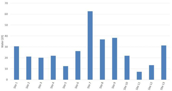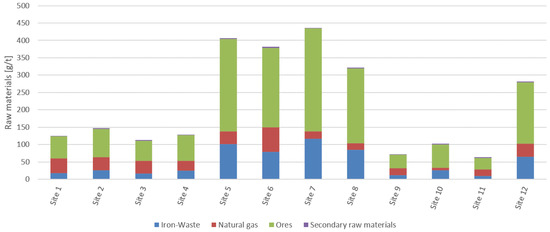 Figure 10 shows the LCA for the current state regarding water consumption. Depending on the type of processing, water consumption ranges from 8 to 60 L/ton. The results for the consumption of other raw materials per functional unit (FU) are given in Figure 11. Here, the raw materials are secondary raw materials, iron, natural gas and ores which are consumed during the process of aggregate production. The GEMIS base data does not distinguish between the type of secondary raw materials, but refers to all mineral material in the material cycle which could be recycled. The results for Sites 5–8 stand out in view of their low resource productivity, meaning that more raw materials are consumed during the production process than at the other sites (Figure 11).