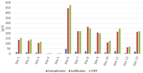 The LCA results with regard to the production of aggregates is determined by the energy demand for electricity and diesel for power units and the vehicle fleet. Regarding electricity, the damage potential is primarily determined by the value pre-chain, i.e., largely coal burning. This is particularly obvious at Site 5, where the CED is more than 100 kWh above the reference value of Ostrau while running at only 50% of maximum capacity. Clearly, energy consumption has a dominant influence on almost all impact categories, especially those linked to the value pre-chain (exploration, transformation, etc.). Figure 12, Figure 13 and Figure 14 show that Site 5 has the maximum values in each category, and therefore we can expect the greatest environmental impacts occurring here. However, an increased environmental risk can be detected at almost all sites. Figure 14 shows the LCA for the current state regarding the environmental impact categories eutrophication, acidification potential and TOPP.