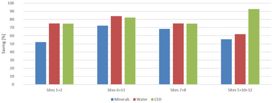 Based on the current operating capacities derived from field observations, it was assumed that the merging of adjacent sites could improve capacity utilization at each individual site by at least 50%, with significant energy and resources savings as well as reductions in emissions as some machines and vehicles enjoy higher utilization rates while others are discarded. Furthermore, it is assumed that water consumption will not change as the utilization of the equipment is increased; as the water is recycled, merging merely increases the throughput volume. The quantity of explosives also remains unchanged, since it can be assumed that the type of extraction does not change. The resource savings are shown in Figure 15 without a breakdown of specific minerals as this depends on the material to be mined. Figure 16 and Figure 17 give the LCA results for the merging options regarding global warming potential, eutrophication, acidification potential and TOPP. Savings in terms of the emission indicator (IE) were calculated according to following formula: