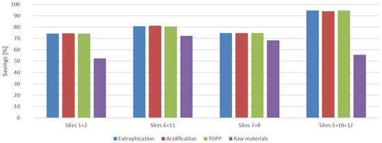 Regarding the resource efficiency exploitation potential caused by site merging, we note a positive pollutant balance for all opencast mines. In all impact categories, the location merging achieves savings in the range of 52% to 94%.