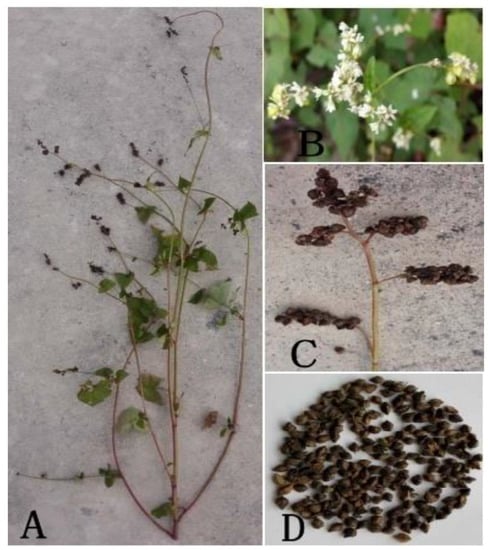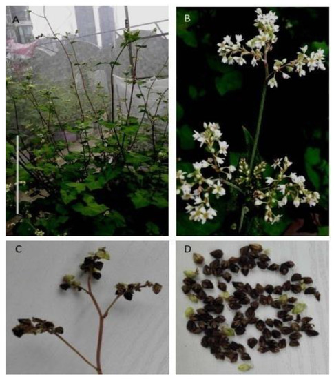 A perennial tartary buckwheat variety—Gui Duoku60. (A) plant; (B) inflorescence; (C) Fruit branch; (D) achenes [14].