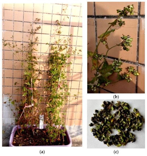 - Lee, B.S.; Ujihara, A.; Minami, M.; Hirose, T. Breeding of interspecific hybrids in genus Fagopyrum. 4. Production of interspecific hybrid ovules culture among F. esculentum, F. tataricum and F. cymosum. Breed. Sci. 1994, 44 (Suppl. 1), 183. [Google Scholar]