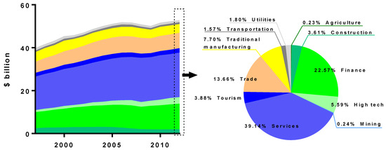 Percentage contributions of varied industries to New Hampshire’s Gross Domestic Product from 1997 to 2012 (left panel) and in 2012 [54] (right panel).