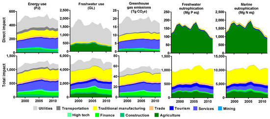The historical life cycle impacts of the 11 aggregated NH industrial categories in terms of life cycle energy use, freshwater use, GHG emissions, freshwater eutrophication, and marine eutrophication during the years from 1997 to 2012 are provided in Figure 2. Figure 2 presents both direct (the first row) and total (the second row) environmental impacts of NH industries. Significant differences in terms of impact scales and industrial contributions can be observed between direct and total impacts of each type. In general, total impacts represent around 2.5–6.5 times of direct impacts when summing the values of the 11 industrial categories. This indicates the significance of the supply chain impacts, which might not occur within the state (when raw materials and semi-finished products are imported), but are embedded in the products being produced. For instance, NH imports a significant portion of its food, energy, and clothing from outside of the state [53]. On the other hand, some of the products processed or produced in NH are not eventually consumed within the state. For example, electric machinery and equipment, timber, plastics, and pharmaceutical products are among the top exported products in NH [72]. An outstanding question is the extent to which economic development planning within a state context would value supply chain vs. local environmental impacts. It also has to be noted that the sum of the total impacts by 11 industrial categories should be perceived as the maximum possible impacts because of the likelihood of double counting. For example, the environmental impacts of food production in NH are included in the agriculture category. Nevertheless, they could also be included in service industries as part of their indirect environmental impacts if locally produced food is used to provide these services. Double counting primarily results from inter-industry transactions, which ranges from around 32% of the total industrial output for the trade category up to around 62% of the total industrial output for the traditional manufacturing category (averaged value of the study period of 1997–2012). Under an extreme case of all materials and semi-products being provided from within the state, the traditional manufacturing category, for instance, could double count as much as 62% of its environmental impacts under the EIO-LCA framework. Nevertheless, given the high import rates of NH commodities from outside of the state, the double counting rates could potentially be low. Yet, it is still important to note the possibility of overestimation of the total aggregated environmental impacts. The percentages of intermediate industrial outputs out of the total industrial outputs for each industrial sector are provided in the SI.