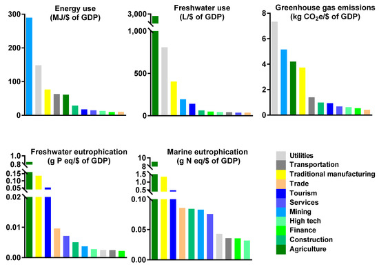 In order to understand the environmental and economic tradeoffs of each industry, the five total environmental impacts of each industry were normalized to impacts per $ of GDP, and ranged from the highest unit impact to the lowest. Results from the year of 2012 are presented in Figure 3. Among all 11 industrial categories, mining has the highest life cycle energy use per $ of GDP generated, while utilities present the highest GHG emissions intensity. Furthermore, the eutrophication potential and water use of the agriculture industry are much higher than other industrial categories. This is consistent with previous results reported by [34], where the water demands of agricultural sectors per dollar of industrial output are the highest among all industries. As agriculture is often a fundamental element of a state’s economy, it is desirable to invest in water efficient agricultural technologies and practices to reduce its impact on water resources per generated GDP. Traditional manufacturing is always among the top four industries in all five types of environmental impacts. The utilities category is ranked the second highest industry in terms of energy use and water use, but it is among the lowest in terms of freshwater and marine eutrophication potentials. Tourism is ranked third in terms of freshwater and marine eutrophication potentials, and it is also ranked relatively high in terms of water use. On the other hand, high tech is always among the bottom four industries in terms of the five environmental impacts. The high economic but low environmental payoffs of high tech indicate that it could be a potentially viable option in further strengthening the NH economy with lower environmental trade-offs than other options.