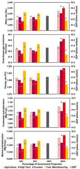 The greenhouse gas emissions, water and energy uses, and freshwater and marine eutrophication under 20%, 50%, and 200% of government projected growth rates of the four target industrial sectors in 2030.