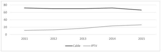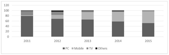 The recent convergence trend in the media and broadcasting industries disassembles the existing industrial structure and forms a new industrial system. The recent trend shows that convergence between fixed line and mobile networks is increasing. Due to the emerging movement, convergence of media, telecommunication, and information technology (IT) industries facilitates “triple play” (convergence of telephony, Internet, and TV) or “quadruple play” (convergence of telephony, mobile services, Internet, and TV) []. Continuous innovation enables the diffusion of technologies, and the technological convergence allows consumers to access media content through various devices through the Internet connection []. Not only economic utility but also changing viewing habits of media audiences have reduced the dominance of TV, and increasingly mobile devices are used for viewing which has caused the big transition in the market. Several statistics also reflect the change in South Korea, which implies the weakening usage of traditional networks such as cable networks (see Figure 1) and the rise of mobile usage (see Figure 2).