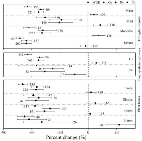 Percent change of net photosynthesis (Pn), stomatal conductance (Gs), transpiration (Tr), and water-use efficiency (WUE) under three different moderators: photosynthetic pathway (C3 and C4 plants), drought stress (mild, moderate, and severe), and plant forms (trees, shrubs, herbs, and lianas). Numbers near the symbols specify the number of data points, and the error bars show the 95% confidence interval (CI).