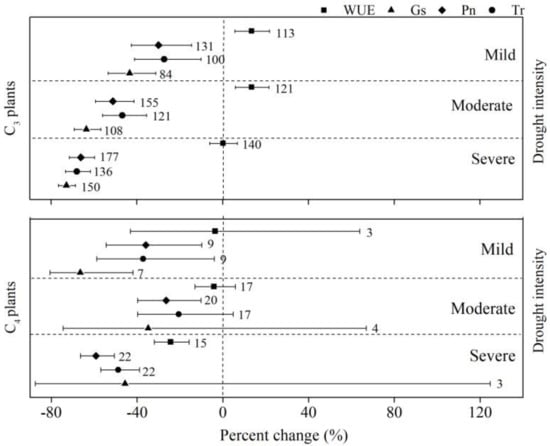 Comparison of the percent change of net photosynthesis (Pn), stomatal conductance (Gs), transpiration (Tr), and water-use efficiency (WUE) for photosynthesis pathways (C3 and C4 plants) under different drought intensities (mild, moderate, and severe). Numbers near the symbols specify the number of data points, and the error bars show the 95% CI.