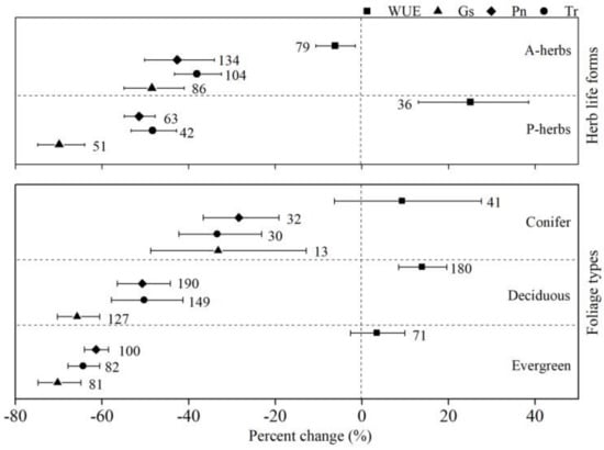 Percent changes of net photosynthesis (Pn), stomatal conductance (Gs), transpiration (Tr), and water-use efficiency (WUE) for herb life forms (A-herbs and P-herbs) and tree foliage types (conifer, deciduous, and evergreen). Numbers near the symbols specify the number of data points, and the error bars show the 95% CI.