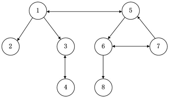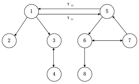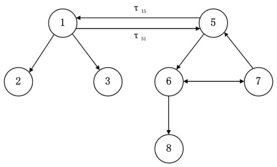 Consider n nodes that interact with each other. The relationship between them can be expressed as a directed or undirected graph. A graph consists of a node set and an edge set . If the edge of the graph is an unordered pair of nodes, , where , the graph is considered undirected. Similarly, if the edge of the graph is an ordered pair of nodes, , the graph is considered as directed. is the adjacency matrix. When , ; otherwise . The neighbouring nodes of can be expressed as . The in-degree (i.e., the sum of the elements of the ith row of matrix A) of node i is defined as . Subsequently, the in-degree matrix is defined as , and the Laplacian matrix L is defined as . If a path between any two nodes, in an undirected graph, can always be determined, then this graph is called a connected graph. In the case of a directed graph, it is called a strongly connected graph. Considering a directed graph, if every node except the root node has only one parent node, the directed graph is a directed tree. If a directed graph contains a directed tree, this directed tree is called a directed spanning tree to a directed graph. The following is an important lemma on the directed graph: