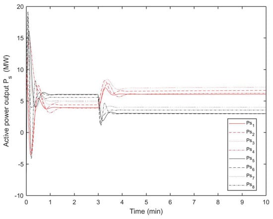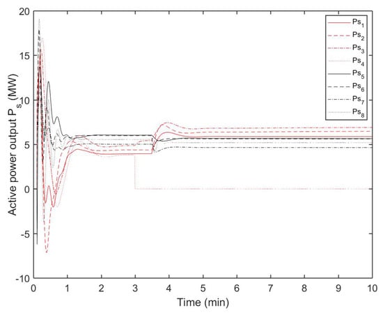 , the power outputs of wind turbines 5, 6, 7 and 8 are reduced to 3, 3, 4, and 3.5 MW, respectively. According to the complementary control strategy, the active output of each unit in wind farm