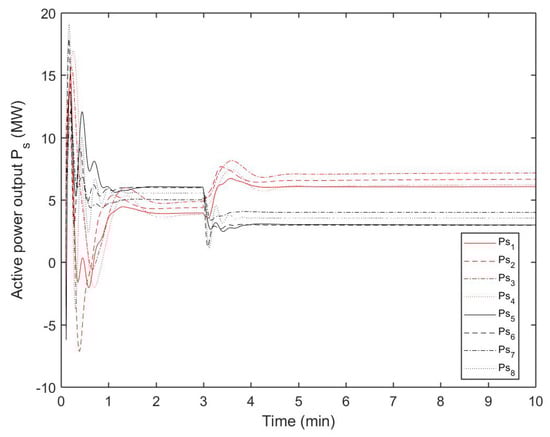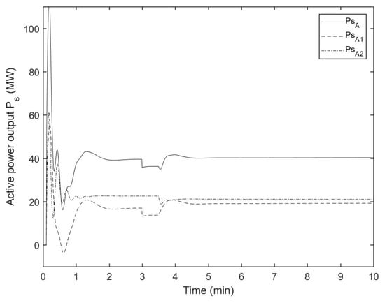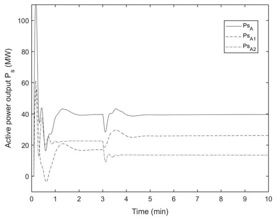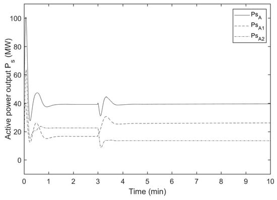 Figure 5 shows the sums of the active power outputs of the wind farms. Before the 3 s, the wind turbines in the two wind farms are in steady state and the sum of the active power outputs of the two wind farms is 40 MW. Assuming that at 3 s the wind speed is reduced in wind farm