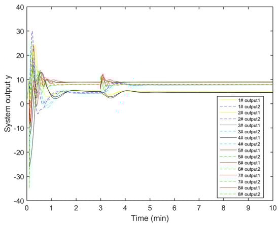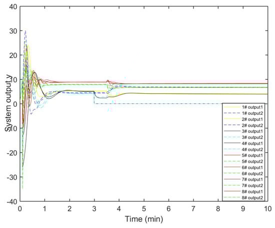 (1) Prior to 3 s, the two wind farms achieve output synchronization, and () and () converge to and , respectively. The sum of all () converges to the set value MW.
