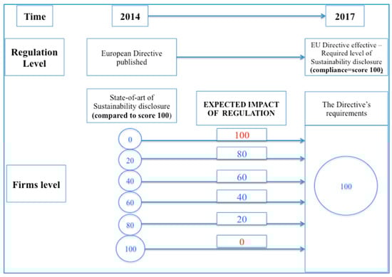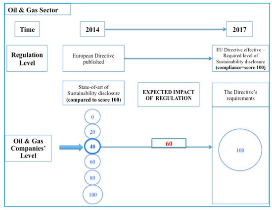 In particular, in the sphere of accounting regulation [3,4,5,6,7], the study focuses on the expected impact of the Directive within the analysis of empirical evidence before the mandatory approach. According to this framework, the study contributes to the debate on the quality of regulation [8] because it examines whether the Directive is a good regulation, i.e., if it achieves its policy objectives of improving sustainability disclosure. Therefore, analysis consists of the study of sustainability disclosure of companies along the reference lines of the content (what) and organization of the information among the company reports (where) before the Directive. The empirical analysis has been carried out in the oil and gas sector, since it is considered evolved in terms of disclosure [9,10,11]. According to the IA, if the regulation could impact on this sector, it would be the same for less-informed ones.