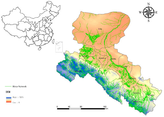 The Heihe River basin (Figure 1) (38°–42° N, 98°00′–101°30′ E) is the second largest inland river basin in the arid region of northwestern China, and forms a typical desert oasis zone [51]. The region extends from the northern base of the Qilian Mountains, through the Zhangye Basin in Gansu Province, to the Ejina Banner of Inner Mongolia [17,52]. However, some tributary rivers and mainstems have ceased to flow after long-term water resource exploitation. Three independent subsystems have formed in the east, middle and west parts. The east subsystem includes more than 20 rivers, including the mainstem of the Heihe and Liyuan rivers. The middle subsystem consists of the Maying and Fengle rivers. The west subsystem includes the Taolan and Hongshui rivers [53,54].