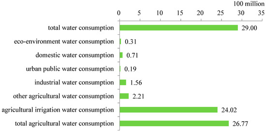 The study area includes oasis agriculture zones in the middle and downstream regions of the Heihe River in Gansu, and has been a local major agriculture development zone for many years [29]. It consists of Ganzhou and Suzhou districts; Gaotai, Shandan, Minle, Linze, and Jinta counties; and Sunan Yugur Autonomous County. A very important issue in this area is how to improve WUE. Thus, this paper mainly focuses on WUE using data from the Heihe River basin. Economic development in the basin largely depends on agricultural production, which is highly water-consuming. Statistics show that agriculture consumes the largest proportion of water resources in the basin, reaching about 92.31% of the total, of which irrigation water accounted for 89.73%, in 2011 (Figure 2). The water diversion policy has been complemented in the Heihe River Basin since 2000, which constrains water use for agricultural production in the middle reaches. Thus, it is urgent to improve the agricultural water use efficiency in this area. The study area is located in Gansu Province, and here the agricultural production is quite similar; maize comprises up to 85% of crops grown, alongside vegetables and other crops. Vegetable crops are used for daily food, while maize is produced for sale as well as food.