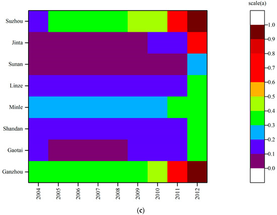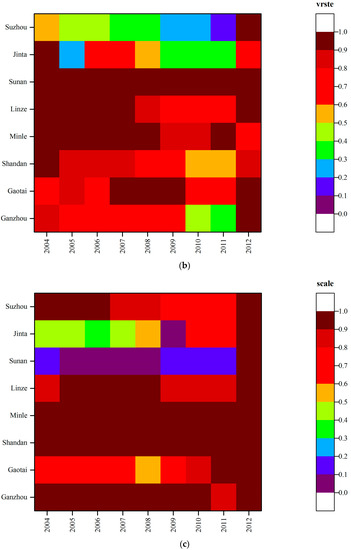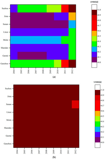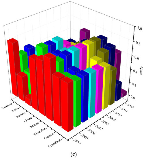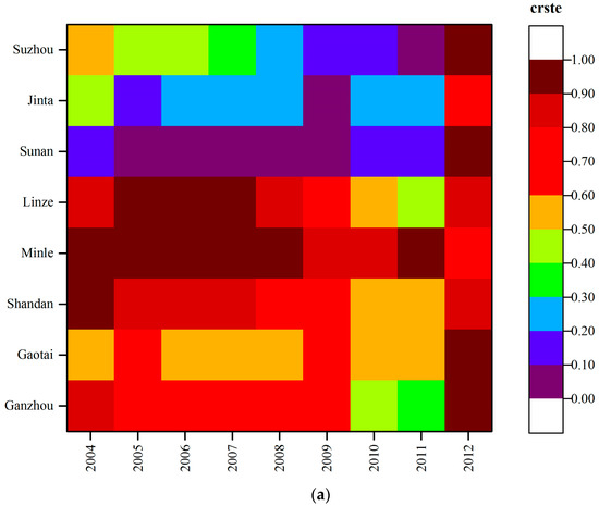 Regarding county-scale time difference (Figure 3), in 2004, the technical efficiency of Shandan and Minle was located on the frontier, which is equal to 1 (Figure 3a); while the technical efficiency of Jinta was the lowest. The pure technical efficiencies of Shandan, Minle, Sunan, and Jinta were equal to 1 (Figure 3b). The scale efficiencies of Shandan and Minle were also equal to 1 (Figure 3c). By 2012, the technical efficiency of Minle was equal to 1, and the pure technical efficiencies of Ganzhou, Sunan and Suzhou were equal to 1. The scale efficiencies of Ganzhou, Shandan, Minle, Sunan and Suzhou were equal to 1. The main reason for the changes is that the various efficiencies measured by our approach represent a relatively comparative concept. Between 2004 and 2012, the agricultural production area of the Heihe River basin substantially increased. In particular, agricultural production land reclamation entered a period of rapid development. Thus, the scale efficiency has increased, especially beginning in 2012. In addition to the five counties above, scale efficiency of the other counties was above 0.91 (Figure 3c), indicating that the scale of efficiency to enhance the space was smaller. The technical efficiency of Minle was on the frontier. Since the 12th Five-year Plan, Minle has been committed to transforming traditional to modern agriculture, and its industrial structure improved considerably, leading to an intensive and professional mode of agricultural production and management. Because of improvement in organization and socialization, the agricultural water resource efficiency of Minle also increased.