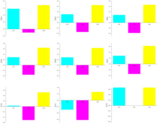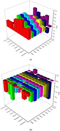 Specifically, in 2012, the technical efficiency of Suzhou was the highest, reaching the frontier; i.e., an efficiency value = 1. The smallest technical efficiency value was that of Sunan. Compared with 2004, values for Sunan had not changed much overall, but its technical efficiency had clearly increased by a small amount. The pure technical efficiency of Sunan was >0.9 prior to 2012, and the scale efficiency difference was obvious, with an increase to 0.296 in 2012.